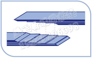 分别在输送带两个端头划─与中心线垂直的线,再从直线与输送带任意一边的交点向端头内以30%带宽为长度划一点,连接该交点和直线与带边的另一交点,即是接头的斜角度。然后根据公式计算出搭接长度、确定阶梯数。